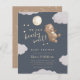We can bearly wait! Cute teddy bear theme budget baby shower invitation featuring a watercolor illustration of a bear cub holding a balloon with some clouds and stars around it. Handwritten script and elegant typography complement the design placed against an off-navy blue background. This invitation is great for a gender-neutral shower in the fall.