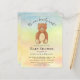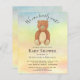 This Budget Couple's Baby Shower Invitation is decorated with a cute teddy bear on a colorful watercolor background and the words "we can bearly wait!"