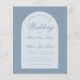 A modern wedding invitation. On a dusty blue background, it has white arch with dusty blue text in it. The word Wedding and the names are written in an elegant calligraphic script, the first line is arched text.