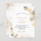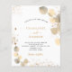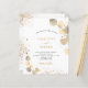 A white background decorated with golden eucalyptus and faux gold glitter dust. Personalize and your name and ceremony details. Black and golden colored letters.
