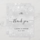A wedding thank you card. A faux silver metallic looking background color. With faux glitter dust. On front, a large hand lettered script and the text: Thank You, your monogram initials, names and a date.