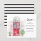 This card features a watercolor red front door, red brick walls, two house plants on each side of the door, and the house number on the door.