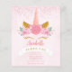 A modern, girly and whimsical first birthday invitation designed with a cute unicorn horn, blush pink floral and curly smiling eyelashes and a chic calligraphy lettering of the birthday girl's name with a sprinkle of delicate rose gold glitter on the top center. The back of the invite features a pastel colored rainbow stripes.