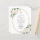 Elegant white roses are nestled in sage green leaves and decorate a gold fame. A gold cross tops the text.