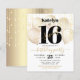 “Happy Sweet 16”. Send out this stunning, simple, festive, modern, personalized party invitation for an event to remember. Bold, graphic, black typography and handwritten script overlay gold balloons and gold sparkly string lights on a sophisticated, white background. Personalize the custom text with your daughter’s name as well as other party details. Great for the budding fashionista who loves modern glitter and glam and guaranteed to add stylish fun to her special party!