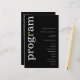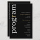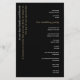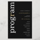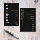 BUDGET Stylish White Gold Text Black Wedding Program. A budget price size 5.5” x 8.5”, on an elegant 110 lb LINEN stock – for a luxury feel at great value, this is perfect for menus, as well as invitations and programs etc. This budget size alternative is also available in other paper choices. The SEMI-GLOSS 110 lb card stock is about the same thickness as a postcard, so also works well for invitations. The FELT 100 lbs paper is buff colored, NOT white, so adds a rustic touch. The MATTE 80lbs paper stock is bright white, for crisp printing, great for your menus and programs, whilst the SATIN 80lbs paper is thin and light A modern typographical design with Program in large typography in white with the ”r” in gold, rotated and to the left hand side on a background of black.