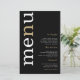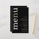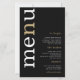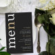 Simple White Gold Typography Black Wedding Menu. A budget price size 5.5” x 8.5”, on an elegant 110 lb LINEN stock – for a luxury feel at great value, this is perfect for menus, as well as invitations and programs etc. This budget size alternative is also available in other paper choices. The SEMI-GLOSS 110 lb card stock is about the same thickness as a postcard, so also works well for invitations. The FELT 100 lbs paper is buff colored, NOT white, so adds a rustic touch. The MATTE 80lbs paper stock is bright white, for crisp printing, great for your menus and programs, whilst the SATIN 80lbs paper is thin and light A modern typographical design with Menu in large typography in white with the ”n” in gold rotated and to the left hand side on a black background.