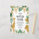 Celebrate your little wild one's first birthday with this jungle safari themed invitation, featuring gold faux foil animals (giraffe, lion and monkeys), gold and green jungle foliage, and a sprinkling of gold confetti. Add your child's name and party details in black text on a white background. A coordinating jungle foliage pattern in green and gold on a white background decorates the back of the card.