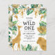 Celebrate your little wild one's first birthday with this jungle safari themed invitation, featuring gold faux foil animals (giraffe, lion and monkeys), gold and green jungle foliage, and a sprinkling of gold confetti. Add your child's name and party details in black text on a white background. A coordinating jungle foliage pattern in green and gold on a white background decorates the back of the card.