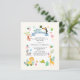 Cute jungle safari animals themed birthday invitation featuring tropical animals, an exotic bird, and other cute party elements. Send out the invites and celebrate the first birthday of the wild one with friends and family.