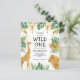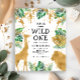 Celebrate your little wild one's first birthday with this jungle safari themed invitation, featuring gold faux foil animals (giraffe, lion and monkeys), gold and green jungle foliage, and a sprinkling of gold confetti. Add your child's name and party details in black text on a white background. A coordinating jungle foliage pattern in green and gold on a black background decorates the back of the card.