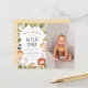 Showcase the birthday boy's photo alongside a cute birthday party invite! This budget and modern invite appears to the left with a frame of green watercolor leaves and safari animal friends. The text features the birthday boy's name with "is turning a wild one!" with your event details below. Cards reverse to a pastel yellow color with white hand-drawn lines and doodles. Click on "Personalize" to change the wording. As part of the budget selection on Zazzle, this sheet isn't a standard invite size or paper quality. If you want this design on an invitation card you can find it in our store or use the Zazzle Make Machine to transfer it onto the product of your choice. Feel free to contact me if you have any questions - I'll be happy to help!