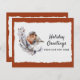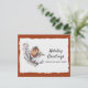 A cute rust and gray colored winter robin sits on a branch of white and green leaves against a snowy white deckled edge paper background. The design itself is overlaid on a warm rust color drawn from the bird's own feathers. The example text on front of our budget new address Christmas card reads "Holiday greetings from our new home." This text and all text on back of the card can be revised easily - or deleted for hand-writing - via the personalization template.