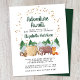 Budget-friendly rustic baby shower by mail invitation featuring a cute illustration of woodland animals with their tent camping in the mountains and forest, an overlay of gold stars and "Adventure Awaits" and the mother-to-be's name in a dark hunter green script. Easily personalize the shower by mail details.