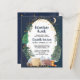 Budget-friendly rustic baby sprinkle invitation featuring a cute illustration of woodland animals with their tent camping in the mountains and forest, an overlay of gold stars and moon in a nighttime sky and "Adventure Awaits" and the mother-to-be's name in a dark midnight blue script. Easily personalize the baby sprinkle shower details.