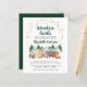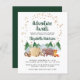 Budget-friendly rustic virtual baby shower invitation featuring a cute illustration of woodland animals with their tent camping in the mountains and forest, an overlay of gold stars and "Adventure Awaits" and the mother-to-be's name in a dark hunter green script. Easily personalize the shower details and add an online link or text number or email address to obtain the link.