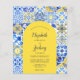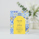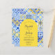 This rustic design features a background pattern of blue, yellow and white watercolor Portuguese tiles, or azulejos. Personalize it with the names of the bride and groom in blue calligraphy script and the remaining text in a combination of sans serif, copperplate and italics on a yellow arch shape. A matching tile pattern appears on the reverse side.