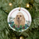 On the front of this Holiday ornament is a beautiful portrait of an adorable buff colored American Cocker Spaniel dog peeking out of a holly and evergreen bough. Red berries and pine cones decorate the holly and pine sprigs. The image is placed on a white circle within a thin red line circle. The back of the ornament has the same evergreen bough wreath and circle with your custom text in red.