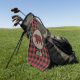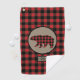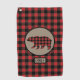 The background on this personalized golf towel is a red and black buffalo plaid pattern. At the center is a tan circle banner with a matching red and black plaid silhouette bear image. Below is a small matching banner with your three letter monogram. Be sure to see the matching golf items in our store.