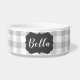 Gray Buffalo Plaid Personalized Pet Name on a Ceramic Dog Bowl food or water with your new puppy or dog's name in a calligraphy script font inside a faux light black chalkboard look fancy shape label. The farmhouse chic style in neutral colors will look great anywhere.