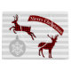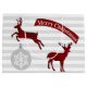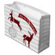 Masculine Christmas gift bag done in a pale gray and white striped background, with red and black buffalo plaid deer cut outs, a gray and white snowflake ornament and a red and white banner reading Merry Christmas. Personalize the text to read what you want.