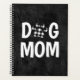 Dog pawprint with "dog mom" text and black and white buffalo plaid pattern on black leather textured background.