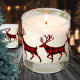 A holiday scented candle featuring a red buffalo plaid patterned stag reindeer with large antlers repeated around the glass candle.