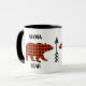 If your mother is a proud "Mama Bear", this is an appropriate mug for any occasion, but especially for Mother's Day or her birthday. A red and black buffalo plaid silhouette bear image walks between two opposing black arrows. The black text below and above the bear image says "Mama Bear". The image and text are repeated on two sides of the mug.