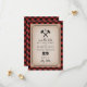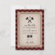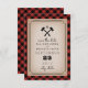 An elegant and rustic wedding save the date invitation featuring a buffalo plaid background and a monogram ax design.