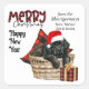 This Holiday sticker features an adorable Newfoundland puppy wearing a red and white Santa hat, and sitting in a woven basket. Behind the dog is a red and black buffalo plaid pillow, and a matching gift package sits beside the basket. Buffalo plaid typography pairs with black script to say "MERRY Christmas", with "Happy New Year" below that. Your custom signature is in two easy to change text fields. Perfect for your Holiday correspondence.