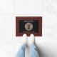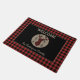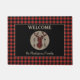 A buffalo plaid silhouette antlered deer head is at the center of a tan circle on this attractive door mat. Opposing black arrows are on each side of the head. The circle is placed on a black background, which is framed with a matching red and black buffalo plaid border. Your custom text is in matching tan above and below the circle and deer image. Perfect for a cabin, or country home, but comfortable at home in the city, too!