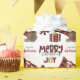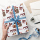 The repeated pattern on this cute Christmas wrapping paper is an image of a red and white Australian Shepherd Dog wearing a Santa hat, with a black and red buffalo plaid pillow behind him, and a coordinating gift package with a gold ribbon beside him. There's also a buffalo plaid bow and the matching text that says "JOY". Stylized red and black buffalo plaid text says MERRY CHRISTMAS", and your own signature is in two fields for you to customize.