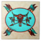 Brighten Your Home with this Unique "One of a Kind" Buffalo Skull And Arrows Ceramic Tile! It Features a Native American Buffalo Skull And Arrows with Feathers on a Turquoise Background...Surrounded by a Southwest Border in Turquoise, Orange & Black Flames!