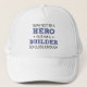 I may not be a hero, but I'm a Builder so close enough humorous word art in sans-serif and doodle cross-hatch font lettering in white and dark blue.