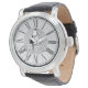 Gift for a builder. Builder is standing with building materials around him. A fun watch for a builder, building materials supplier, or construction worker. Stylish gift builder's watch. Bold roman numerals and a black, white and grey watch face. Builder watch.
