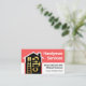 Design features a tall building frame in a red and white layered cover. Inside the building is a set of gold handyman tools about to commence remedial works. At the top is the business name "Handyman Services" which you can change followed by the contact details and a slogan caption option.