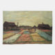 Bulb Fields by Vincent van Gogh is a vintage fine art post impressionism floral landscape nature painting. A farm field of blooming spring flowers with a farmer walking, the sky is filled with grey storm clouds. A farmhouse is in the distance.