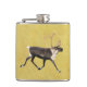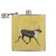 A bull caribou, or reindeer, superimposed on a brain-tanned leather background. The caribou (Rangifer tarandus), known as the reindeer outside of North America, is a deer of the Arctic and Subarctic. While overall widespread and numerous, some subspecies are rare and one has gone extinct. The Inuit word tuktu means - deer that never stops moving. Caribou are always on the move, going north to calve, heading for the winter grounds, and south in the summer. Caribou considerably in colour and size. Uniquely among deer, both genders grow antlers, though these are larger in the males and there are a few populations where females lack them completely. Caribou hunting and herding of semi-domesticated reindeer (for meat, hides, antlers, milk and transportation) are important to several Arctic and Subarctic people. Even far outside its range, the caribou/reindeer is well known due to the myth, probably originating in early 19th century America, in which Santa Claus's sleigh is pulled by flying reindeer, a popular secular element of Christmas. In actual Lapland, reindeer would pull a pulk. Distribution and habitat The caribou/reindeer is a widespread and numerous species in the northern Holarctic, being present in both tundra and taiga (boreal forest). It was originally was found in Scandinavia, eastern Europe, Russia, Mongolia, and northern China north of the 50th latitude. In North America, it was found in Canada, Alaska (USA), and the northern conterminous USA from Washington to Maine. In the 19th century, it was apparently still present in southern Idaho. It also occurred naturally on Sakhalin, Greenland, and probably even in historical times in Ireland. During the late Pleistocene era, reindeer were found as far south as Nevada and Tennessee in North America and Spain in Europe.Today, then species has disappeared from many areas within this large historical range, especially from the southern parts, where it vanished almost everywhere. Large populations are still found in Norway, the Markku region of Finland, Sweden, Siberia, Greenland, Alaska, and Canada. Domesticated reindeer are mostly found in northern Fennoscandia and Russia, with a herd of approximately 150-170 reindeer living around the Cairngorms region in Scotland. The last remaining wild tundra reindeer in Europe are found in portions of southern Norway. A few reindeer from Norway were introduced to the South Atlantic island of South Georgia in the beginning of the 20th century. Today, there are two distinct herds still thriving there, permanently separated by glaciers. Their total numbers are no more than a few thousand. The flag and the coat of arms of the territory contain an image of a reindeer. Around 4000 reindeer have been introduced into the French sub-Antarctic archipelago of Kerguelen Islands. East Iceland has a small herd of about 2500–3000 animals. Caribou and reindeer numbers have fluctuated historically, but many herds are in decline across their range. This global decline is linked to climate change for northern, migratory caribou and reindeer herds and industrial disturbance of caribou habitat for sedentary, non-migratory herds. Fur Fur color varies considerably, both individually, and depending on season and subspecies. Northern populations, which usually are relatively small, are whiter, while southern populations, which typically are relatively large, are darker. This can be seen well in North America, where the northermost subspecies, the Peary Caribou, is the whitest and smallest subspecies of the continent, while the southermost subspecies, the Woodland Caribou, is the darkest and largest. The coat has two layers of fur, a dense woolly undercoat and longer-haired overcoat consisting of hollow, air-filled hairs. Antlers Reindeer antlers grow again each year under a layer of fur called velvet. In most populations both sexes grow antlers, which (in the Scandinavian variety) for old males fall off in December, for young males in the early spring, and for females in the summer. The antlers typically have two separate groups of points, a lower and upper. Domesticated reindeer are shorter-legged and heavier than their wild counterparts. There is considerable subspecific variation in the size of the antlers (e.g., rather small and spindly in the northernmost subspecies), but in some subspecies the bull reindeer's antlers are the second largest of any extant deer, after the moose, and can range up to 39 inches (100 cm) in width and 53 inches (135 cm) in beam length. They have the largest antlers relative to body size among deer.Antler size plays a significant role in establishing group hierarchy. Nose and hooves Reindeer have specialized noses featuring nasal turbinate bones that dramatically increase the surface area within the nostrils. Incoming cold air is warmed by the animal's body heat before entering the lungs, and water is condensed from the expired air and captured before the deer's breath is exhaled, used to moisten dry incoming air and possibly absorbed into the blood through the mucous membranes. Reindeer hooves adapt to the season: in the summer, when the tundra is soft and wet, the footpads become sponge-like and provide extra traction. In the winter, the pads shrink and tighten, exposing the rim of the hoof, which cuts into the ice and crusted snow to keep it from slipping. This also enables them to dig down (an activity known as "cratering") through the snow to their favorite food, a lichen known as reindeer moss. The knees of many species of reindeer are adapted to produce a clicking sound as they walk. Diet Reindeer are ruminants, having a four-chambered stomach. They rely primarily on lichens in winter, especially reindeer moss. However, they also eat the leaves of willows and birches, as well as sedges and grasses. There is some evidence to suggest that on occasion, they will also feed on lemmings, arctic char, and bird eggs. Reindeer herded by the Chukchis have been known to devour mushrooms enthu