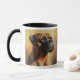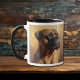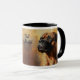 This mug celebrates the majestic Bull Mastiff dog! Two sides of the mug have a beautiful portrait of a brown Mastiff against an abstract background. Predominant colors are orange, yellow, and shades of brown and tan. At the center is script that says Bull Mastiff, but you may change it or even personalize it, if you wish.