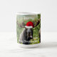 A bull moose with a nice rack and sticking out his tongue looks festive in a red Santa hat.