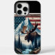 A majestic bull moose with large antlers stands in a forest scene with a majestic mountain peak behind it, all framed by an American flag on weathered wooden planks.
