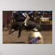 Cowboy rides a bucking bull and hangs on for dear life at a rodeo