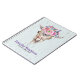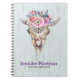Watercolor bull skull with pink flower, buds and horns over light blue pattern background with arrows. Customizable notebook template