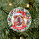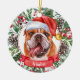 This sophisticated ceramic Christmas ornament features a bulldog with his tongue hanging out in a Santa hat, surrounded by holiday greenery, pinecones and berries, with a red banner with your pet's name (or change to Merry Christmas). You can fully personalize this design by changing the greeting and year on the back in an elegant font. This is a stylish, yet inexpensive, custom Christmas ornament, and it's perfect for bulldog lovers, dog lovers, or pet lovers.