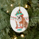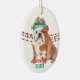 A beautiful Bulldog wears a red and green Santa Claus hat in front of strings of red and green Christmas beads on both sides of this ornament. At the bottom are two text fields in matching red and green for your own text. The back has the same image with a third text field in red. Perfect for anyone who is owned by a Bulldog!