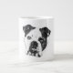 Close-up bulldog in crisp B&W for calm December starts. Warm mug, quiet cheer, tree-light glow.