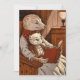The image shows a warm scene of two ferrets, one adult and one young, sitting in a wooden armchair. The adult ferret, wearing a red and white scarf, holds a large book with a red binding, while the youngest, wearing glasses, is comfortably seated on his lap. The room is dimly lit by a lamp placed on a side table, throwing a warm glow on the stage.