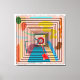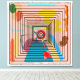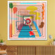 A vibrant and colorful geometric pattern featuring centered concentric squares draws the eye inwards, surrounded by various abstract shapes in bright hues. A targeted arrow points towards the focal point, adding a sense of direction and movement.