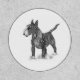 A hand-drawn ink illustration of a Bull Terrier made into a patch. This design is based on my original artwork, and all rights are reserved.