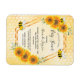 Elegant, fun baby shower invitation, gender neutral. Yellow background with a golden honeycomb pattern. With a faux gold geometric frame. Decorated yellow, orange sunflowers and happy bumble bees. With the text: Baby Shower and the name om the mommy to bee on front written with a modern hand lettered style script. Black letters. Not just an invitation but can be used as a save the date reminder for the guests.